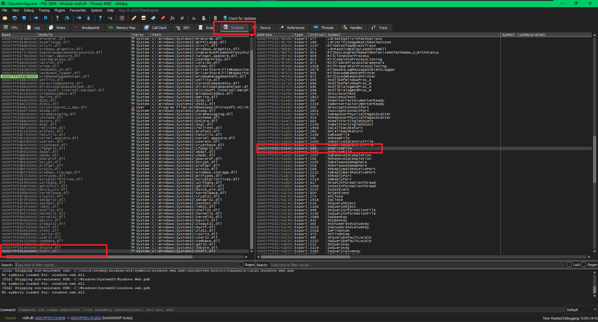 In the above image, I have opened x64Dbg and to find SSN of any function we can simply, go to the "Symbols" tab and in the left panel we can see all the dlls which the process has loaded. We can find ntdll.dll in the bottom, clicking on which we can see all the functions it exports, one of them is NtWriteFile with Ordinal 688. Double clicking on the entry brings us back to the “CPU” tab where we can see the following: