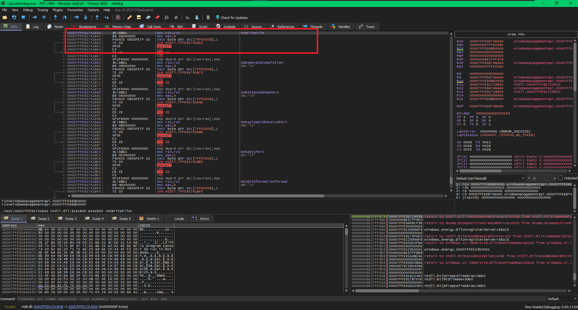 NtWriteFile inside the debugger